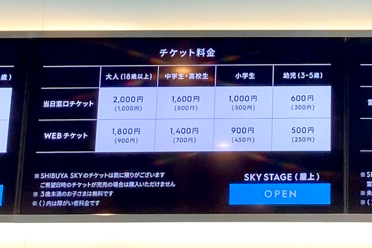 展望台への入場は料金がかかります。チケットの価格は以下の通り↓